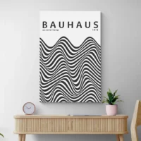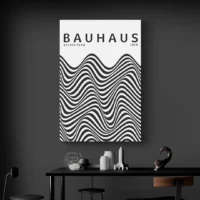 Cette Affiche Bauhaus 1919 noir et blanc impose un rythme sobre. On voit un fond blanc, un grand bloc noir rectangulaire, des lignes noires nettes qui croisent l'espace. Le texte "BAUHAUS 1919" apparaît en lettres majuscules, sans empattement, et donne une présence typographique. On remarque aussi un petit cercle noir en haut à droite et une bande verticale qui descend. Le tout joue sur le contraste fort noir et blanc, simple et percutant. Le noir tranche, le blanc respire, et l'ensemble reste rythmé.
