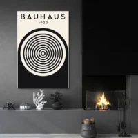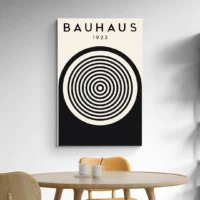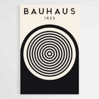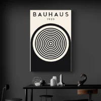 Cette Affiche Bauhaus 1923 blanc et noir impose le regard avec sa palette réduite, noir et blanc, et un contraste très marqué. On voit de grandes lettres en majuscules, des blocs rectangulaires et des cercles, associés à des lignes fines qui structurent la composition. L'ensemble reste très géométrique, net, presque architectural. Le noir profond répond au blanc lumineux, et la typographie prend toute la place.