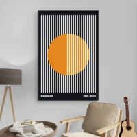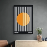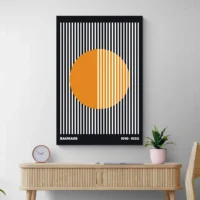 Sur un mur blanc ou clair, les tons orange et noir ressortent immédiatement. Avec un cadre noir, l’effet se renforce. On peut l’associer à pièces en bois clair et textiles beiges pour tempérer. Pour aller plus loin, découvrez nos affiches Bauhaus ou nos tableaux géométriques.