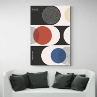 Ce Affiche Bauhaus rouge et bleue impose une présence visuelle simple et claire. On voit un grand cercle rouge, un rectangle bleu posé à côté, et quelques lignes noires qui tracent des directions. Le fond reste clair, presque blanc, ce qui fait ressortir les couleurs. Les formes ont des bords nets, précis. On ressent tout de suite la rigueur et la vivacité, oui, la vivacité des couleurs.