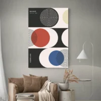 Accrochez-la sur un mur blanc pour un rendu lumineux ou sur une surface grise pour un contraste plus marqué. Associez-la à cadres fins noirs ou à meubles clairs. Pour prolonger le thème, regardez notre collection Bauhaus ou nos tableaux géométriques.