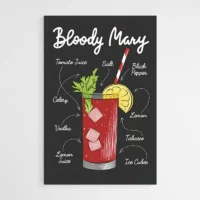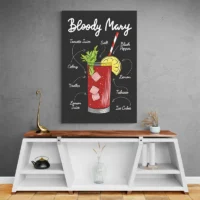 Cette Affiche Bloody Mary présente un grand verre rempli d’un cocktail rouge vif, une branche de céleri dressée à la verticale et une tranche de citron posée sur le bord. Le verre laisse apparaître des glaçons transparents et quelques perles de condensation. L’ensemble repose sur un fond sombre qui fait ressortir le rouge du cocktail, avec un lettrage blanc net en haut de l’image.