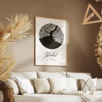La composition donne l'impression de survoler Istanbul. Les contrastes entre bleu, beige et touches de gris rendent l'ambiance sereine et structurée. Cette affiche séduira le fan de voyage, le passionné de géographie, ou toute personne qui veut une déco urbaine et apaisée.