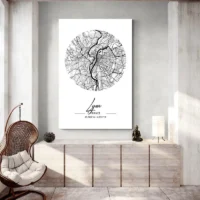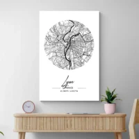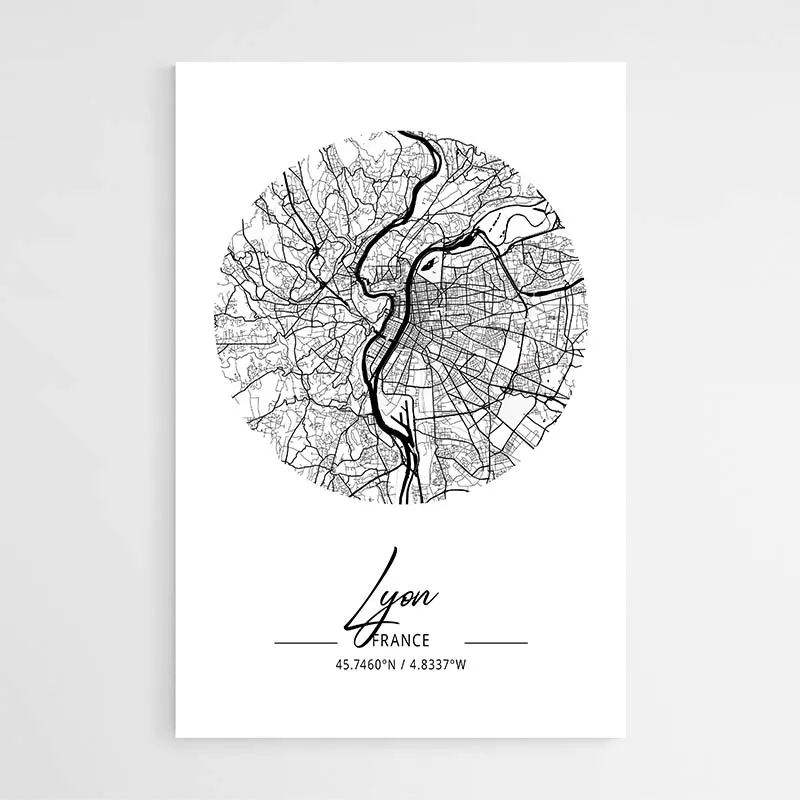 Le style reste minimaliste, graphique et précis. Les contours des voies apparaissent en noir fin, les ponts ressortent, et les zones d'eau offrent un contraste avec le reste de la carte. Cette affiche conviendra à quelqu'un qui aime les villes, la cartographie, ou qui veut garder un souvenir de Lyon. Elle donne un effet ordonné, rassurant, et un repère visuel sur le mur.
