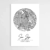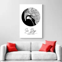Cette Affiche Carte San Diego montre le tracé de la côte et le détail du réseau urbain. On voit clairement la ligne du littoral, des voies représentées par des lignes fines, et des noms de quartiers en lettres lisibles. L'océan apparaît comme une grande surface uniforme et la palette reste sobre, avec des contrastes marqués entre le fond et les tracés. Le titre de la carte se détache en haut, net, simple.