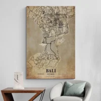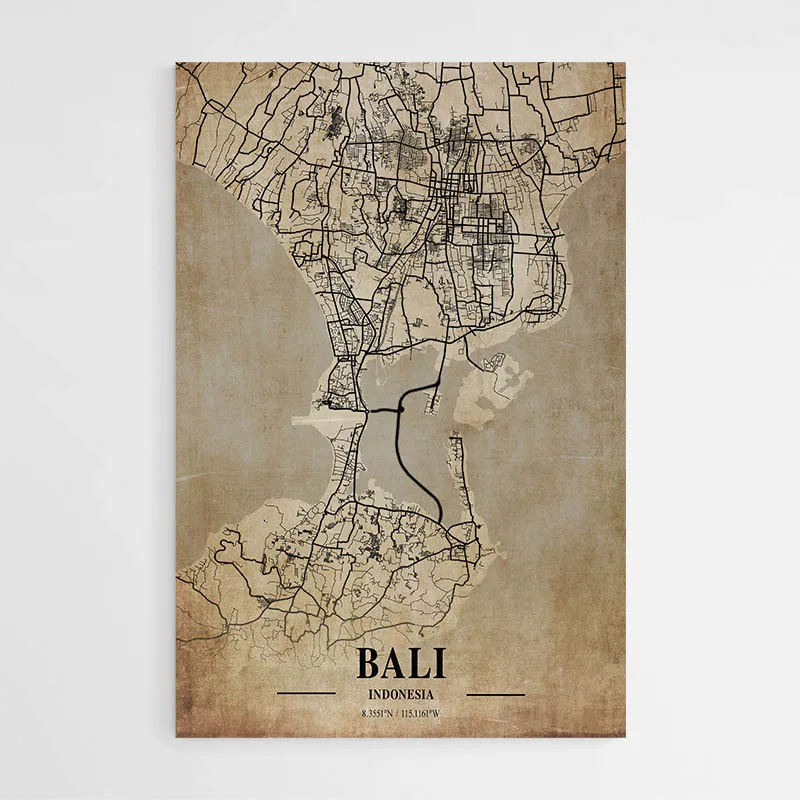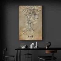 On sent immédiatement l’ambiance d’une carte ancienne. Les lettres sobres et le papier travaillé évoquent la découverte. Ce tableau plaira à qui aime les cartes, la géographie, ou à qui rêve d’escapades à Bali. Il donne une atmosphère contemplative. Il habille un mur sans en faire trop, et attire le regard, encore et encore.