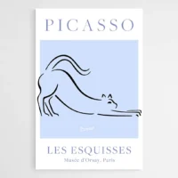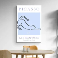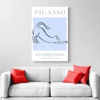 On reconnaît l’influence cubiste dans la simplification des volumes, l’usage de lignes noires et de surfaces colorées. Ce visuel plaira aux amateurs d’art graphique, aux personnes qui aiment une déco originale et aux fans de Picasso. Il donne une impression à la fois calme et vive, légèrement espiègle, qui capte le regard.