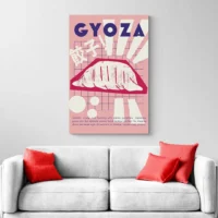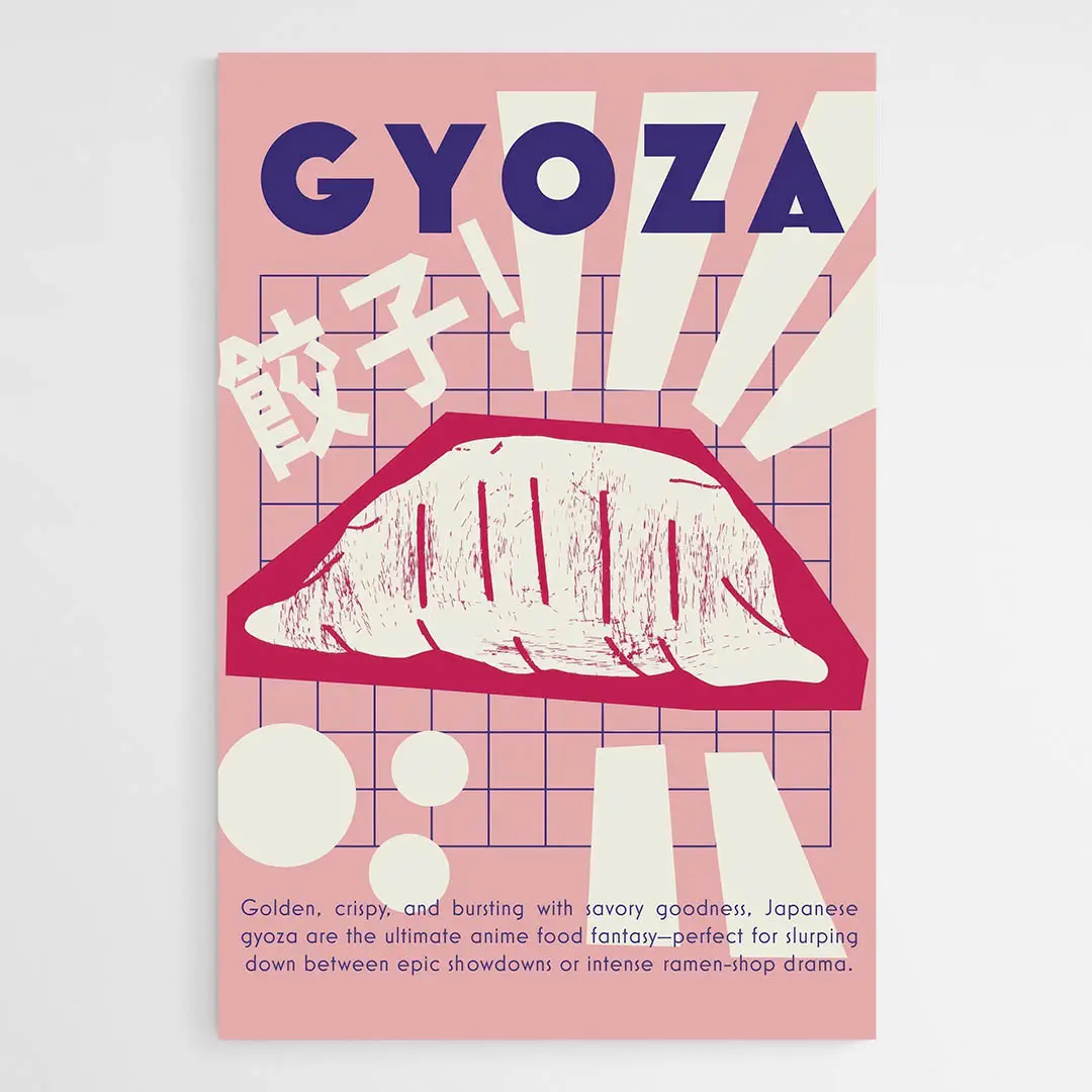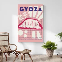 Cette Affiche gyoza montre des raviolis japonais cuits, posés sur une assiette blanche. On remarque la couleur dorée des bords croustillants, les plis réguliers de la pâte et un léger brillant de cuisson. Un petit bol de sauce noire se tient à côté et des baguettes en bois viennent compléter la scène. Quelques graines de sésame parsèment les gyoza, et une feuille verte ajoute un point de couleur. L’ensemble reste simple, net, très appétissant.
