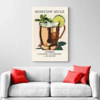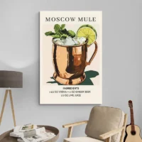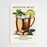 Cette Affiche Ingredients Moscow Mule montre un mug en cuivre bien centré, des glaçons visibles à l'intérieur et une rondelle de citron vert posée sur le bord. Une liste d'ingrédients en noir accompagne les illustrations, avec des lettres nettes et lisibles. Le fond reste clair, presque beige, ce qui fait ressortir les reflets cuivrés et les touches de vert. On ressent tout de suite une impression de fraîcheur, et une envie de préparer le cocktail.