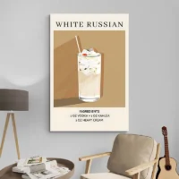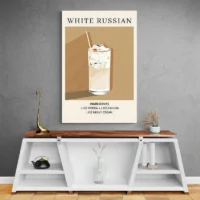 Cette Affiche Ingredients White Russian expose, de façon claire, les éléments du cocktail. Sur un fond blanc on voit un verre bas avec une couche sombre et une couche claire posée dessus. On remarque des glaçons anguleux, quelques grains de café brun foncé et la silhouette d’une bouteille. Le texte typographique noir liste les ingrédients. L’ensemble reste graphique, net. On sent la précision, assez ludique et un peu chaleureux.