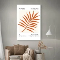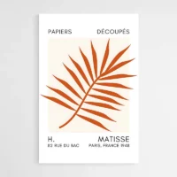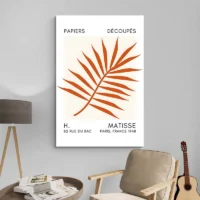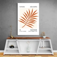On reconnaît l'influence des découpages de Matisse: une grande feuille orange, un contraste fort avec le fond écru, et des lignes souples qui donnent du mouvement. L'ambiance reste calme et graphique. Elle plaira aux amateurs d'art moderne et à ceux qui aiment une déco minimaliste mais chaleureuse. Le format met en valeur la forme, très expressif malgré sa simplicité.