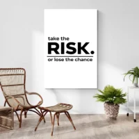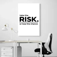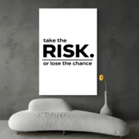 Cette Affiche Motivation - Take The Risk affiche le texte TAKE THE RISK en grandes lettres blanches, posées au centre d’un fond sombre. Les caractères sont en majuscules, gras et très lisibles. Le contraste blanc sur sombre capte tout de suite la lumière, simple et impactant. On voit une mise en page dépouillée, sans image ni motif, juste le mot et l’espace autour. Le rendu donne une impression nette, presque militaire, et ça marche, on le regarde encore.