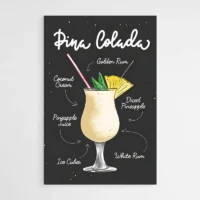 On ressent de la fraîcheur et de la légèreté, un petit air estival. Les dessins d'ananas, de noix de coco et du verre renforcent ce sentiment. Cette affiche plaira aux amateurs de cocktails, aux cuisines et aux petits bars à la maison. Simple et clair, elle montre la recette et les mesures sans fioriture.
