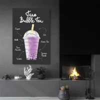 On ressent tout de suite l’aspect gourmand et doux de l’image. Les tons violets, le contraste avec les perles sombres et les lueurs sur le gobelet créent une ambiance légère et appétissante. Cette affiche plaira aux amateurs de boissons sucrées, à ceux qui aiment les couleurs pastel, et à qui cherche une touche joyeuse pour la cuisine ou un coin café.