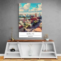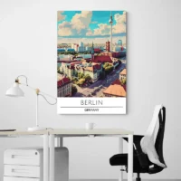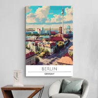Cette Affiche Voyage Berlin Allemagne montre un horizon net, très épuré et presque graphique. On voit le mot "BERLIN" en lettres capitales, des silhouettes de bâtiments alignées, et une tour de télévision qui domine la composition. Le fond reste clair, des aplats de couleur soulignent quelques éléments, et les contours sont nets, précis. Simple et direct, simple, on aime ce côté immédiat.