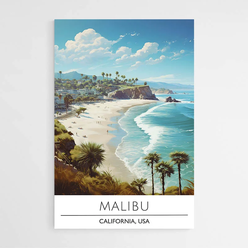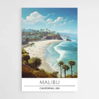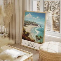Ce Affiche Voyage Malibu donne envie de poser le regard. On voit un grand soleil rond bas sur l'horizon, une mer calme et une plage claire en premier plan. Des palmiers en silhouette se détachent sur un ciel en dégradé rose et bleu. Les couleurs pâles, le rose saumon, le bleu turquoise et quelques touches orangées créent une atmosphère chaude et tranquille. Le rendu reste simple, propre, très graphique.