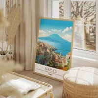 Cette Affiche Voyage Naples capte tout de suite l’œil avec des couleurs chaudes et un air de vacances. On voit le Vésuve en silhouette à l'arrière-plan, une mer bleu profond au premier plan, et des façades ocre et roses qui descendent en terrasses vers l'eau. Un petit bateau glisse sur la baie, et le mot "NAPLES" s'affiche en lettres sobres, bien lisibles. L'ensemble respire la lumière, la chaleur et un calme presque immédiat.