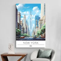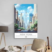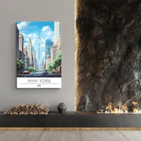 Cette Affiche Voyage New York offre un regard direct sur la ville. On voit une silhouette de gratte-ciel, un pont qui traverse la scène, et la statue emblématique qui se détache sur l’horizon. Le contraste entre les formes nettes des immeubles et le ciel ouvert crée une impression de mouvement, presque de trajet. On ressent l’énergie contenue, la ville qui vibre, la perspective qui invite à regarder encore une fois.