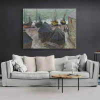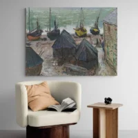 Ce tableau Bateaux sur la plage d'Étretat - Monet capte tout de suite le regard. On voit plusieurs bateaux posés sur le sable, des voiles blanches repliées, la mer bleue au loin et les hautes falaises claires en arrière-plan. Le ciel reste pâle, avec des touches de bleu et de gris. On remarque aussi des petites silhouettes sur la plage et des reflets sur le sable humide. L'ensemble donne une impression de matin calme, douce et un peu fraîche.