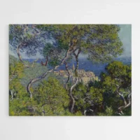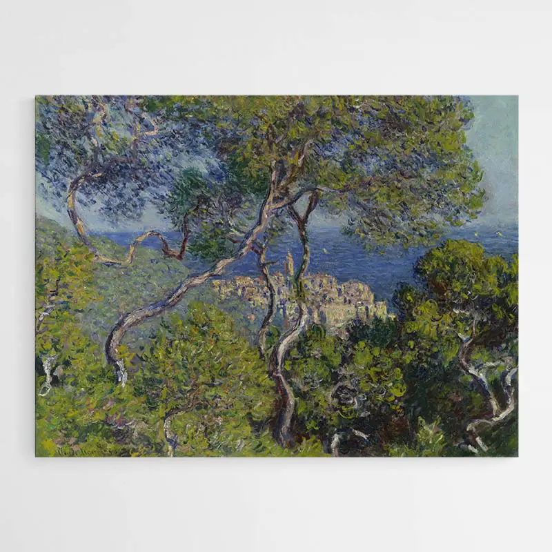 Cette reproduction Bordighera - Monet donne instantanément une impression de bord de mer. On voit un ciel clair, la mer en arrière-plan, des touches de bleu et de turquoise, des murs aux tonalités ocre et rose, et une végétation dense au premier plan. Les coups de pinceau restent visibles, on remarque les empâtements, les petites taches de couleur qui forment le tout.
