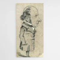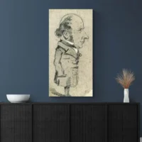 Cette affiche montre un portrait caricatural d'un homme connu, avec des traits volontairement exagérés. On voit une barbe blanche fournie, un chapeau posé sur la tête et un nez marqué qui capte le regard. Le fond reste clair, presque crème, ce qui met le visage au premier plan. Les contours se lisent en trait noir, la bouche esquisse un sourire et les yeux paraissent malicieux, lumineux, vifs.