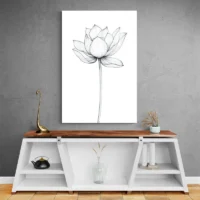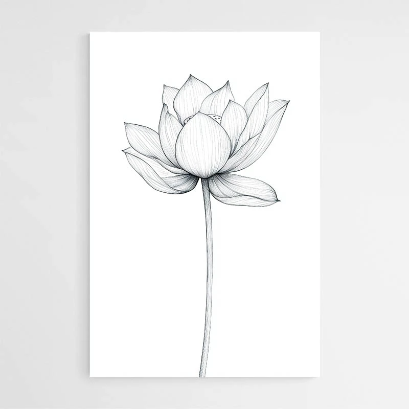 Ce Fleur de Lotus dessin Minimaliste montre une fleur de lotus au trait simple. On voit des traits fins et noirs, un fond clair et des pétales stylisés, arrondis et symétriques. La composition reste centrée. L'espace vide autour crée une sensation d'air et de silence, simple, très sobre.