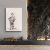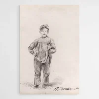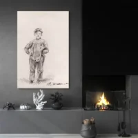 Cette toile Garçon à la campagne - Monet montre un garçon en plein air, posé dans un champ. On voit de larges zones d’herbe verte, des touches jaunes et un ciel bleu clair. On devine le visage du garçon, plutôt flou, et la lumière baigne la scène. Les coups de pinceau rapides donnent du mouvement et la palette reste lumineuse.