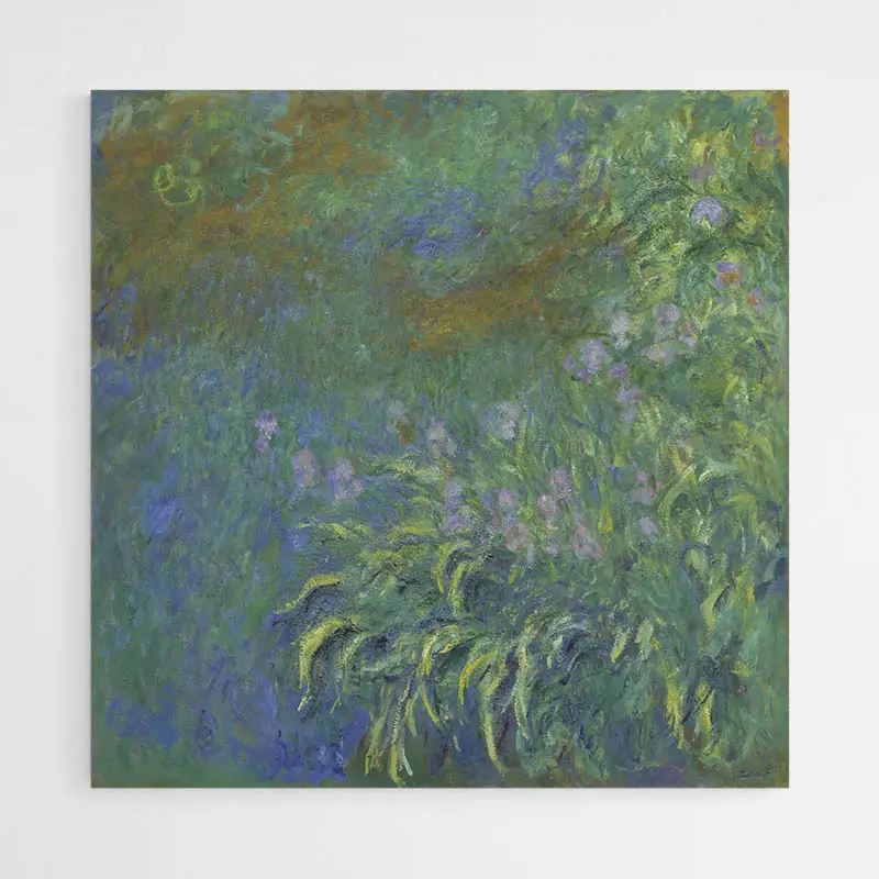 On retrouve Iris - Monet dans une composition sensible. Les couleurs dominantes, violet, vert et bleu, créent une ambiance calme et fraîche. Ce tableau plaira aux amateurs de peinture classique, aux amoureux des fleurs et à ceux qui aiment une décoration subtile et apaisante. On ressent la douceur et la fraîcheur d'un jardin au printemps.