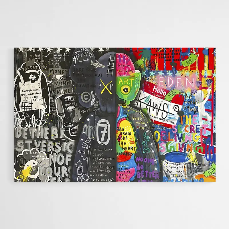 On ressent une présence à la fois douce et un peu mélancolique. On garde une impression solide, presque sculptée. Les yeux en croix donnent un air muet, presque sérieux. Cette toile plaira aux amateurs de rue et aux collectionneurs de personnages illustrés, à ceux qui aiment les images fortes et reconnaissables. Le contraste entre le gris du personnage, le blanc des gants et le fond clair crée une lecture immédiate, tout de suite.