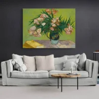 Ce tableau Lauriers - Van Gogh montre des branches de laurier aux feuilles vertes profondes, des nervures nettes et des tiges brunes. Le fond clair crème laisse apparaître des touches jaunes et quelques accents sombres qui structurent l’ensemble. Les coups de pinceau épais créent un relief visible, on perçoit la matière, on sent le geste du peintre, on sent le mouvement.
