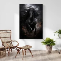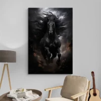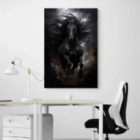 On ressent une présence calme, presque majestueuse. Le cheval regarde de trois-quarts, l’expression reste mesurée, sérieuse, attentive. Le tableau joue sur le contraste entre la robe noire et les touches plus claires sur le museau et autour de l’œil. Il séduira les amoureux d’équitation, les fans d’animaux et ceux qui aiment une déco sobre mais pleine de caractère.
