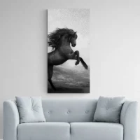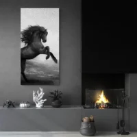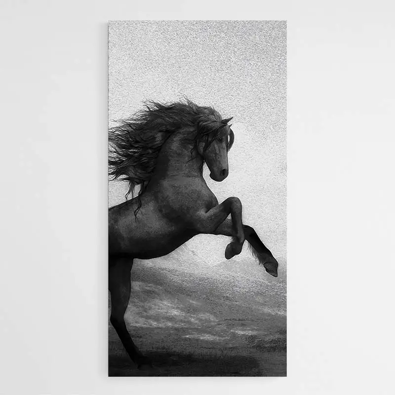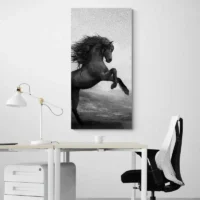 La silhouette du cheval occupe le centre, nette et expressive. La crinière apparaît décoiffée, le coin du cadre laisse respirer la scène, et les touches de peinture ajoutent du rythme. Ce tableau plaira aux personnes qui aiment les représentations animales fortes, à ceux qui cherchent une pièce qui apporte du caractère sans excès.