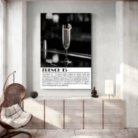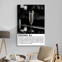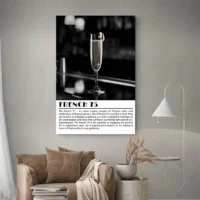 On retrouve une atmosphère raffinée, un peu rétro sans en faire trop. Les bulles, le zeste jaune et le verre transparent donnent une impression de fête discrète. Ce visuel séduira les amateurs de cocktails, ceux qui adoptent une déco de cuisine ou un coin bar soigné, et aussi les personnes qui aiment les affiches minimalistes mais chaleureuses.