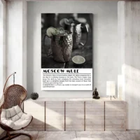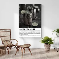Ce Poster Moscow Mule montre un gobelet en cuivre brillant sur une surface sombre. On voit des glaçons transparents, une tranche de citron vert sur le bord, et de fines gouttes de condensation qui brillent sur le métal. Le fond reste très sombre, presque noir, ce qui fait ressortir les reflets chauds du cuivre et les éclats de glace.