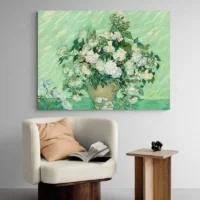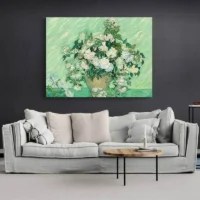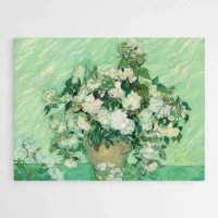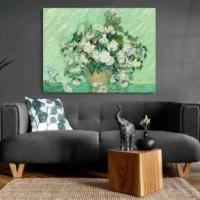 Roses - Van Gogh offre une impression chaleureuse. Les couleurs dominantes jouent entre rose, pêche et vert. Le contraste avec le bleu du fond donne du caractère. C’est une pièce qui parle aux amateurs de peinture traditionnelle, à ceux qui apprécient la touche picturale marquée. L'effet oscille entre douceur et énergie, parfois calme, parfois plus vibrant, selon la lumière de la pièce.