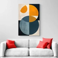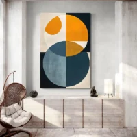 Ce Tableau Abstraction Géométrique montre des formes géométriques superposées sur un fond beige clair. On voit des rectangles et des cercles qui se chevauchent, des lignes diagonales noires et des zones en bleu profond et ocre. Les contours restent nets, avec des aplats de couleur et quelques touches de blanc qui apportent de la lumière. L'ensemble reste sobre mais vivant, simple et rythmé, on revient souvent dessus, on aime ce jeu de plans.