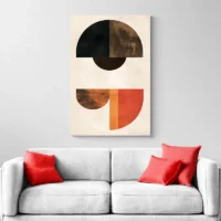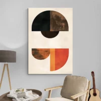 Sur un mur blanc ou gris clair, les oranges ressortent fort. Avec du mobilier en bois clair ou des coussins jaune moutarde, l'ensemble devient cohérent. On peut aussi le marier à d'autres tableaux abstraits ou à des pièces plus modernes.
