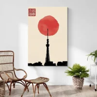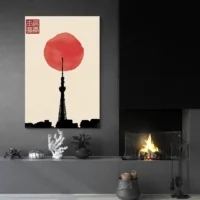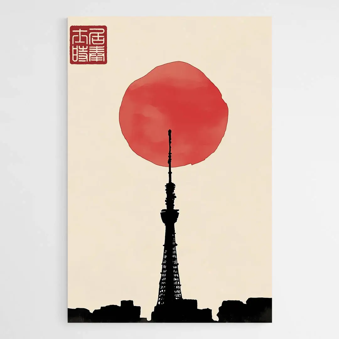 On parle ici d'une toile qui mêle sobriété et mouvement. Les traits noirs guident le regard vers le cercle rouge, qui rappelle le soleil, la couleur chaude. L'effet donne calme et énergie en même temps. Ce tableau séduira la personne qui aime les formes simples, les influences japonaises et les contrastes forts. Il apporte caractère sans alourdir.
