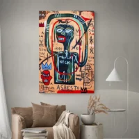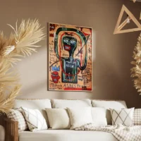 Ce Tableau Africain Basquiat montre un visage stylisé en gros plan, des traits noirs épais, une couronne à trois pointes et des yeux dessinés de façon crue. Le fond mêle ocre et noir, avec des éclats rouges et jaunes qui accrochent le regard. On voit aussi des griffonnages blancs, des chiffres ou lettres rayés, et des touches de peinture texturée qui donnent du relief.