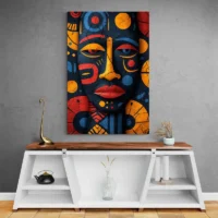 Ce Tableau Africain Coloré montre un portrait stylisé d'une femme africaine en profil, une grande coiffe en tissu plissé, un gros disque d'oreille et des motifs géométriques autour du visage. Les couleurs frappent tout de suite: orange brûlé, bleu profond, vert émeraude et touches jaunes. On note des lignes noires marquées qui découpent les formes, des aplats de couleur et un rendu très graphique. Le contraste entre les teintes chaudes et les teintes froides crée du mouvement, on y revient, on regarde encore.