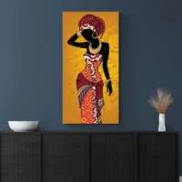 Ce Tableau Africain Orange frappe par sa couleur orange vive en fond et par ses lignes nettes. On voit une silhouette de profil, de couleur noire, un grand turban rayé sur la tête, et un collier de perles blanches autour du cou. Des motifs géométriques blancs et noirs décorent la tunique, avec des traits fins qui rythment la composition. Le contraste entre l’orange et le noir crée une énergie simple et directe. On ressent une présence forte, presque une petite fierté, oui, c’est marqué.