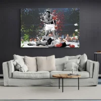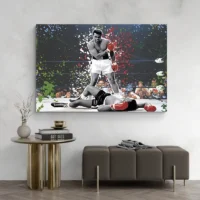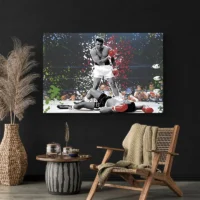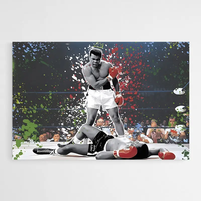 Le Tableau Ali Street Art impose un grand visage stylisé, avec des contours noirs très marqués et des traits graphiques nets. On distingue des éclaboussures de peinture, des coulures fines qui traversent le visage, et des zones d’aplats colorés. Le fond combine des touches rouges, jaunes et un bleu profond, ainsi que des éléments typographiques ou des lettres partiellement visibles. L’ensemble donne un rendu énergique et très immédiat.