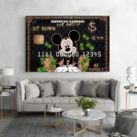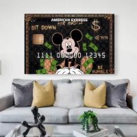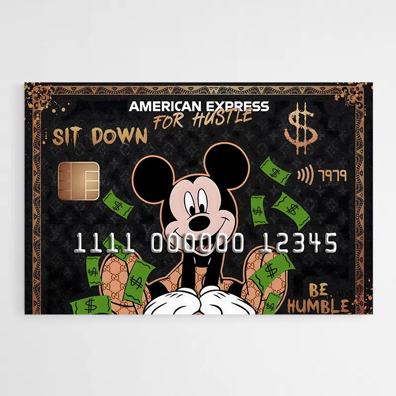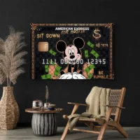 Le Tableau American Express Mickey montre la tête de Mickey en grand, avec des traits noirs très marqués, un large sourire et des oreilles rondes bien visibles. Le fond propose un bleu profond. En haut, on lit le logo American Express en lettres blanches. Le rendu reste net, graphique et immédiatement reconnaissable.