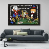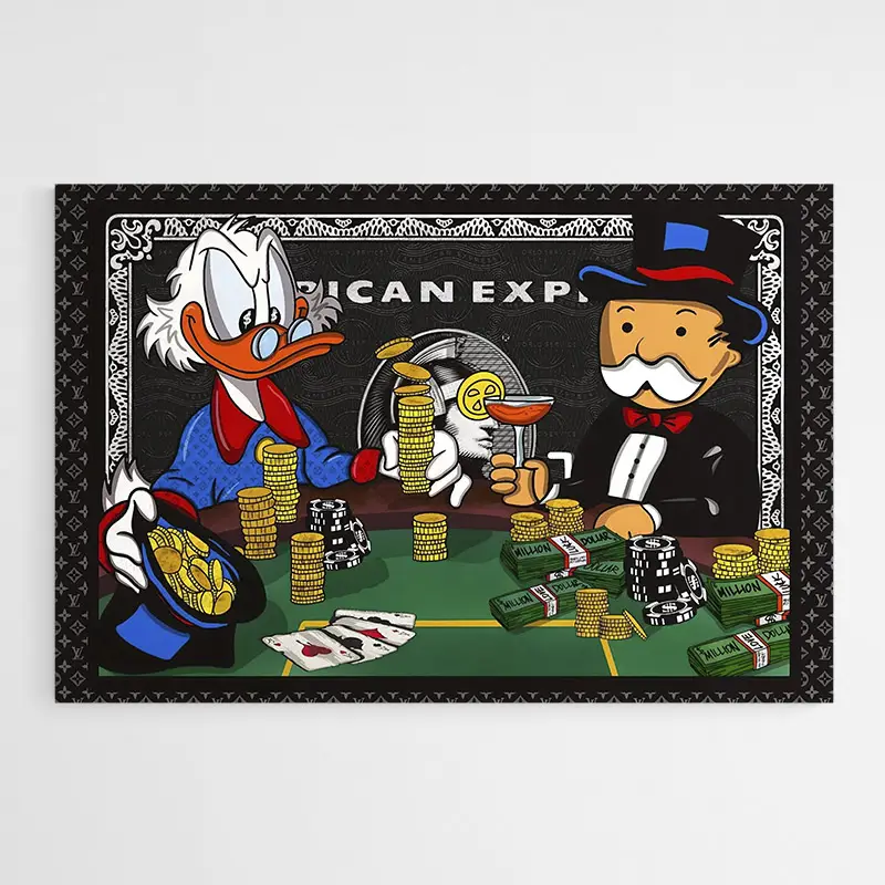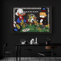 Ce Tableau AMEX Monopoly capte tout de suite l'attention: une grande carte bleue AMEX occupe la majeure partie de la toile, le logo AMEX apparaît en lettres blanches, et le nom du jeu se distingue nettement. On repère aussi le personnage moustachu avec son chapeau haut de forme, ainsi que des jetons et des pièces stylisés. Le fond gris clair reste sobre et renforce le contraste. Les teintes dominantes, bleu, noir et blanc, donnent un rendu graphique et net.