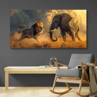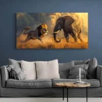 Sur un mur clair, les ocres ressortent mieux. Choisissez un cadre bois foncé ou noir pour renforcer le contraste. Associez des coussins terre cuite, un tapis beige et une plante verte pour prolonger l'ambiance. Pour compléter la déco, regardez nos tableaux d'animaux et nos tableaux africains.