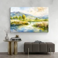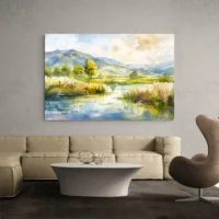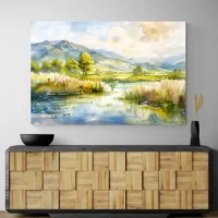 Accrochez la toile sur un mur blanc ou beige pour que les couleurs ressortent. Associez-la à des meubles en bois clair et une plante verte. Pour rester dans la même famille, regardez aussi nos tableaux aquarelle ou nos tableaux paysage.