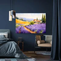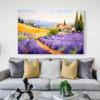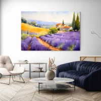 Le Tableau Aquarelle Provence capte l’œil avec ses lavis lumineux. On voit des champs violets et lavande en bandes, de petites maisons aux toits orange et des arbres élancés qui ponctuent le paysage. Le ciel reste pâle, avec des nuances bleues et quelques touches blanches. Les contours restent fluides, coups de pinceau visibles, rendu doux et aérien. Cette toile donne l'impression d'une après-midi calme, d'une brise chaude. On le sent, on se sent apaisé.