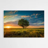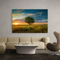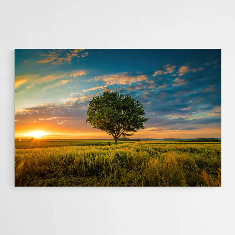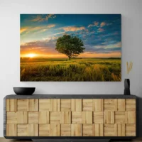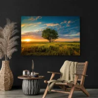 La composition reste sobre, l'arbre occupe le centre et l'horizon est net. Les contrastes forts entre l'ombre noire de l'arbre et la chaleur du ciel créent une image très lisible. Ce tableau séduira les amateurs de paysages, ceux qui aiment la nature, et toute personne qui cherche une ambiance apaisée pour le salon ou la chambre.