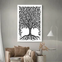 Ce Tableau Arbre de Vie Coloré montre un grand arbre central au tronc et aux branches noirs, posé sur un fond clair. Les feuilles prennent la forme de cercles colorés, rouge, jaune, bleu, vert et orange, qui couvrent la canopée. On voit aussi des racines visibles, fines et ramifiées, qui partent du bas du tronc. L'ensemble donne un rendu graphique, net, très contrasté entre le noir du tronc et les touches vives.