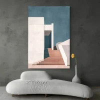 On ressent une atmosphère ordonnée. Les tons se limitent au bleu et au blanc, avec des traits noirs fins qui structurent les volumes. On aimera cette pièce si on aime les espaces nets, l’esthétique sobre et les ambiances modernes. Il donne une sensation de calme, de clarté, presque méditative, et fonctionne comme point d’ancrage visuel.
